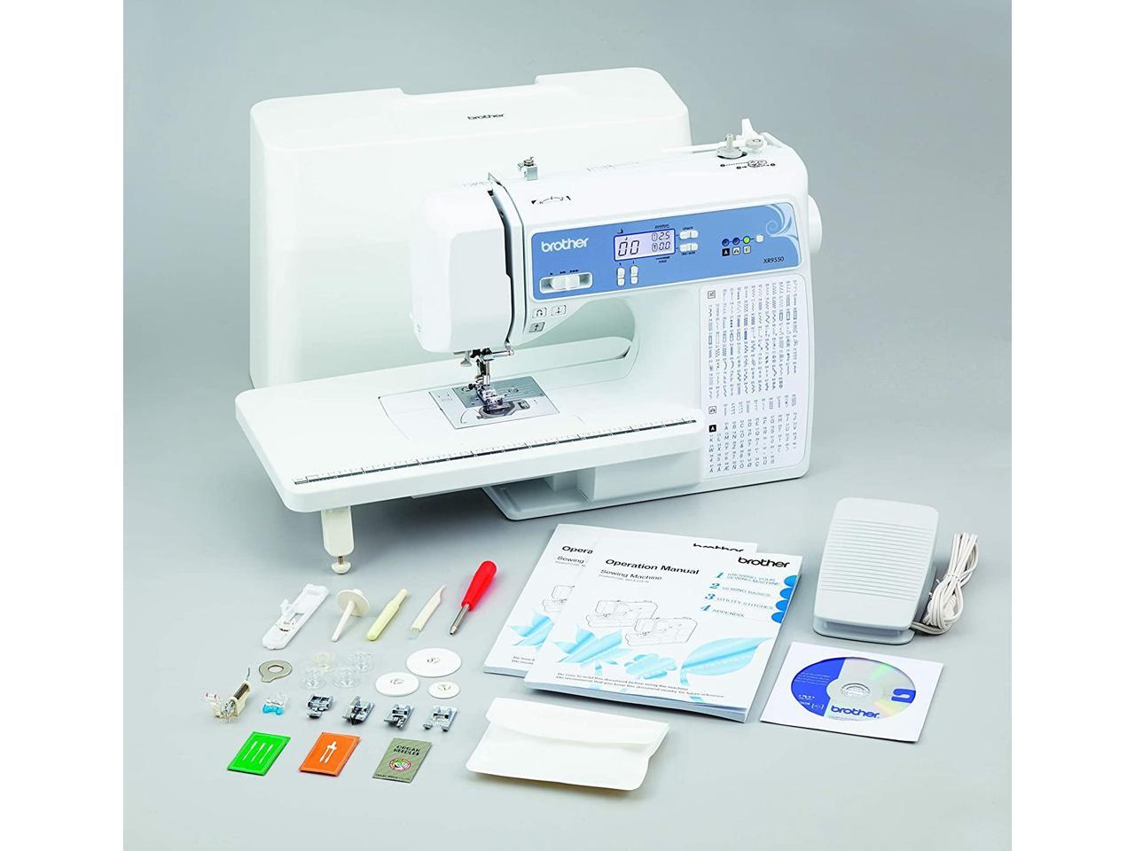 Included accessories: Included with the XR9550 quilting and sewing machine is a protective hard cover, wide table, 8 sewing and quilting feet, instructional DVD and more