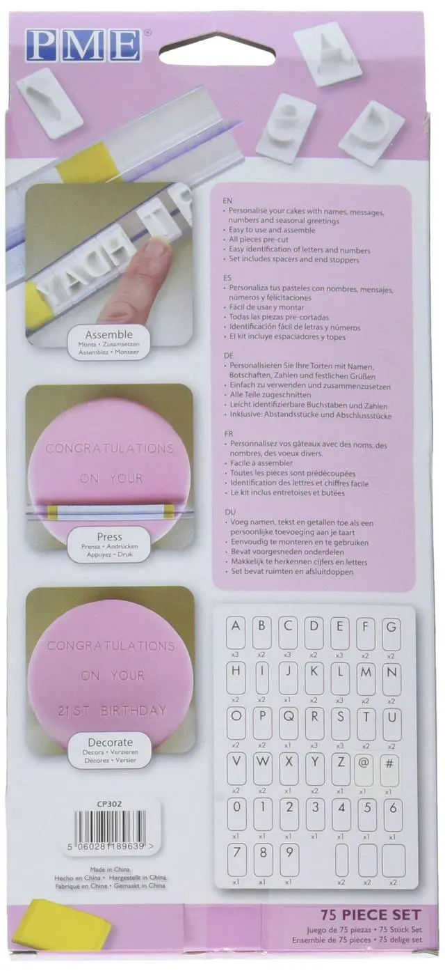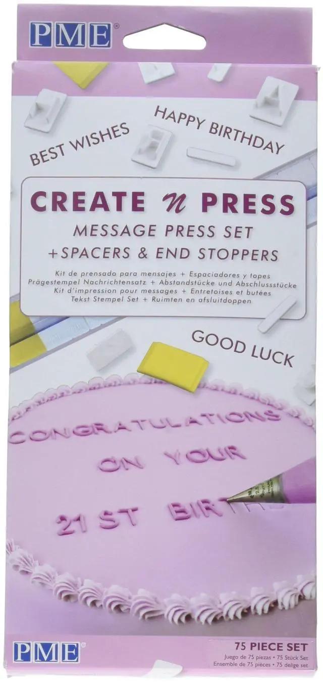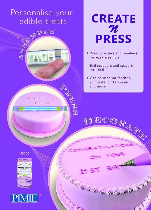PME create N press set. Emboss personalised messages for all occasions onto your cakes with create N press by PME. Create bespoke messages on you cakes using the PME create N press message press. The create N press is simple to use and allows you to create a messages of any type that you can then emboss onto your cake.