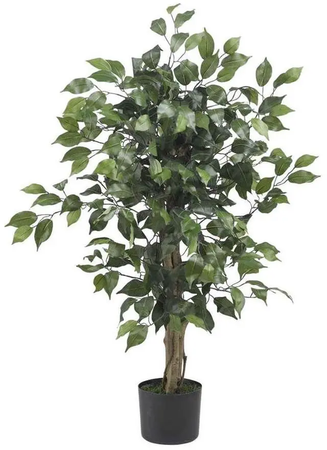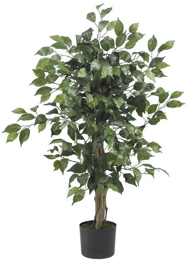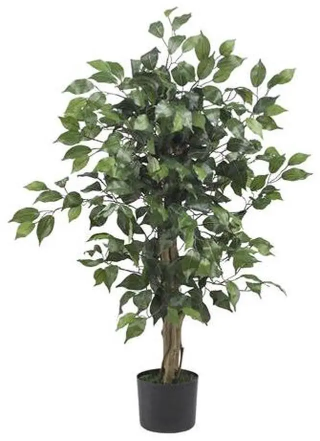 Stately and unique, the Ficus tree is one of most interesting trees around, and will make the perfect complement to any home or office d cor. The twisting trunks reach skyward, and suddenly burst into an explosion of green. With 378 leaves, this tree will fool even the smartest of birds, so watch for nests when you dust! Comes in a black pot with faux soil.