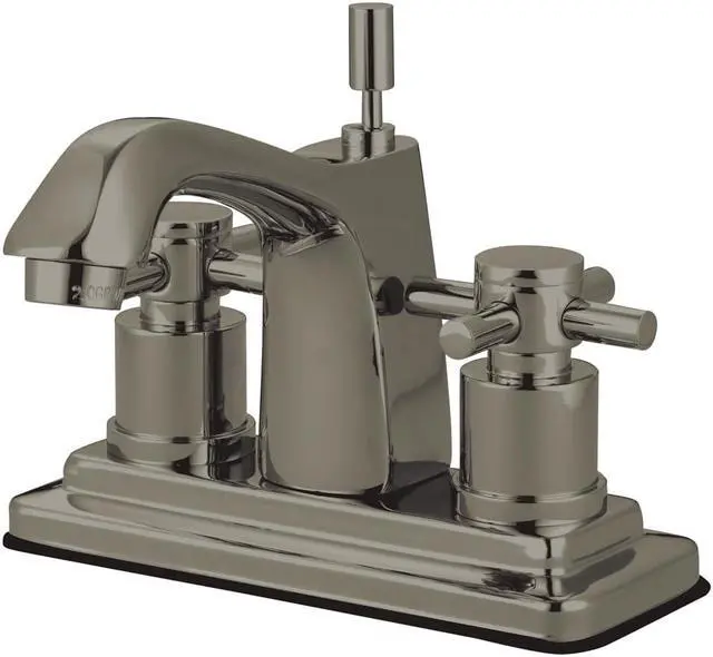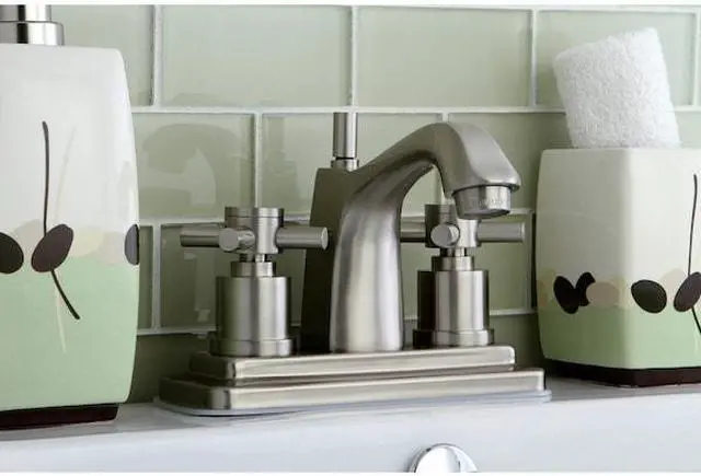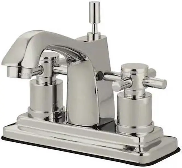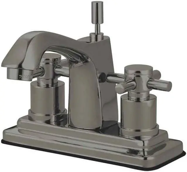 Finish: Satin Nickel Finish; Material: Brass; Country Of Origin: Taiwan, Roc; Theme: Contemporary / Modern; Faucet Holes: 2; Valve Type: 1/4 Turn Ceramic Disc Cartridge; Faucet Centers: 4; Spout Height: 4.38; Spout Reach: 4; Max Deck Thickness: 1.25; Spray Settings: 1; Spray Pattern: Normal; Handle Style: Metal Cross; Handles Included: Yes; Number Of Handles: 2; Escutcheon: No; Pullout Spray: No; Sidespray: No; Soap Dispenser: No;