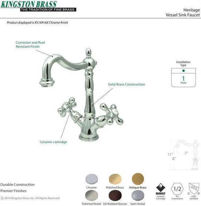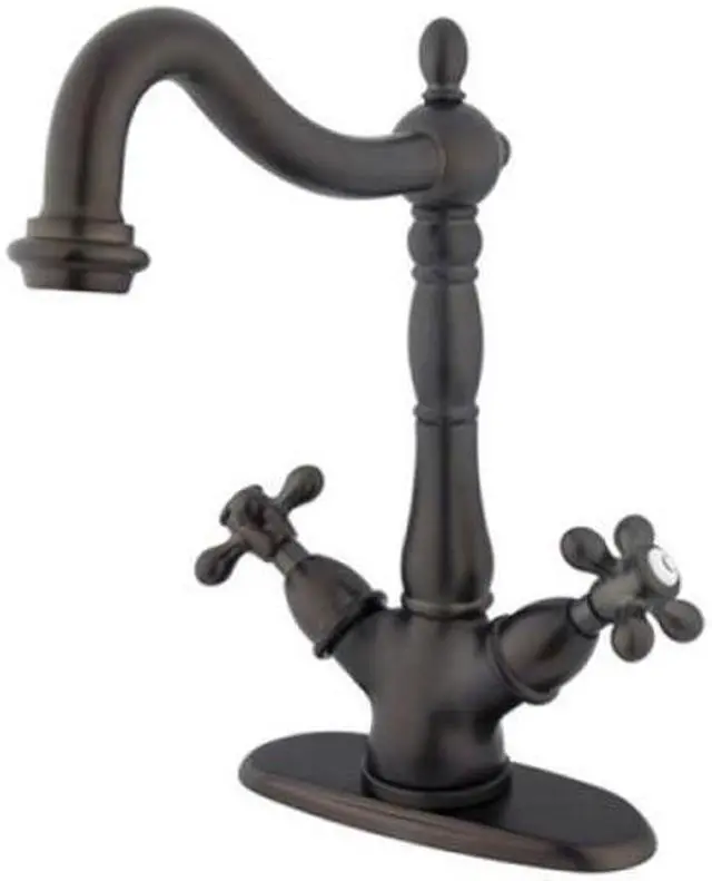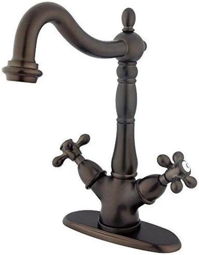 Finish: Oil Rubbed Bronze Finish; Material: Brass; Country Of Origin: Taiwan, Roc; Theme: Classic; Faucet Holes: 1; Flow Rate: 2.2 Gpm; Valve Type: 1/4 Turn Ceramic Disc Cartridge; Spout Height: 10.75; Spout Reach: 8.25; Max Deck Thickness: 1.25; Spray Settings: 1; Spray Pattern: Normal; Handle Style: Metal Cross; Handles Included: Yes; Number Of Handles: 2; Escutcheon: No; Pullout Spray: No; Sidespray: No; Soap Dispenser: No;