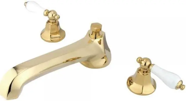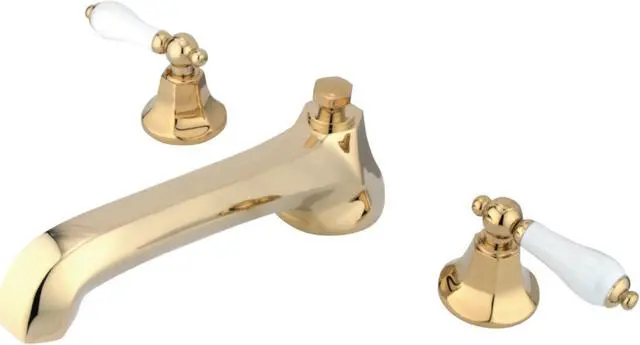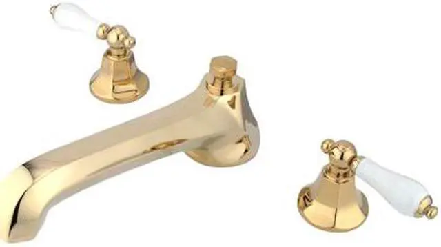 Finish: Polish Brass Finish; Material: Brass; Country Of Origin: Taiwan, Roc; Theme: Contemporary / Modern; Faucet Holes: 3; Valve Type: 1/4 Turn Ceramic Disc Cartridge; Faucet Centers: 8, 16; Spout Height: 3.75; Spout Reach: 8.50; Spray Settings: 1; Spray Pattern: Normal; Handle Style: Porcelain Lever; Handles Included: Yes; Number Of Handles: 2; Escutcheon: No; Pullout Spray: No; Sidespray: No; Soap Dispenser: No;