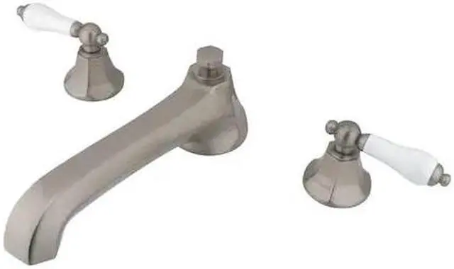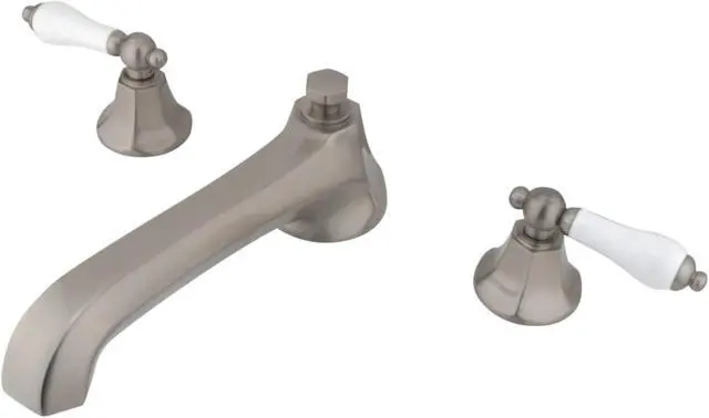 Finish: Satin Nickel Finish; Material: Brass; Country Of Origin: Taiwan, Roc; Theme: Contemporary / Modern; Faucet Holes: 3; Valve Type: 1/4 Turn Ceramic Disc Cartridge; Faucet Centers: 8, 16; Spout Height: 3.75; Spout Reach: 8.50; Spray Settings: 1; Spray Pattern: Normal; Handle Style: Porcelain Lever; Handles Included: Yes; Number Of Handles: 2; Escutcheon: No; Pullout Spray: No; Sidespray: No; Soap Dispenser: No;