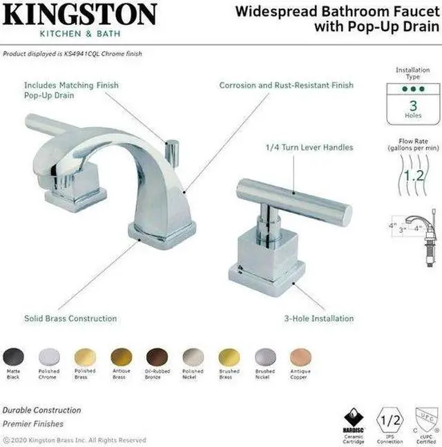 Two Handle Deck Mount- 3 Hole Sink Application- 6 in. to 8 in. Mini-Widespread- 3 hole 4 in. to 8 in. center spread installation- Fabricated from solid brass material for durability and reliability- Premium color finish resist tarnishing and corrosion- 1/4 turn On/Off water control mechanism- 1/2 in. IPS male threaded shank inlets- Ceramic disc cartridge- 2.2 GPM (8.3 LPM) Max at 60 PSI- Integrated removable aerator- 4 in. spout reach from faucet body- 4-1/2 in overall height.FeaturesDrip-free ceramic cartridge systemDesigned for a lifetime of performanceMeets ASME A112.18.1- ANSI/NSF 61 Sec. 9 codeAll mounting hardware includedMatching accessories availableHandle Type - CQLFinish - Polished Chrome