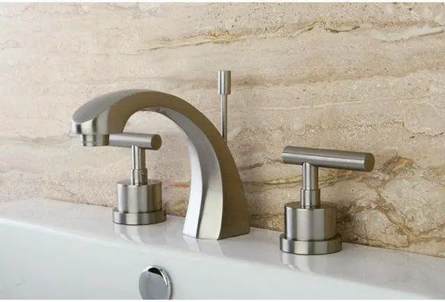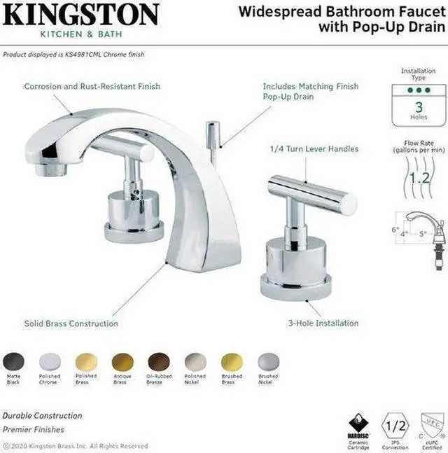 Two Handle Deck Mount, 3 Hole Sink Application, 8" to 16" Widespread, Fabricated from solid brass material for durability and reliability, Premium color finish resist tarnishing and corrosion, 1/4 turn On/Off water control mechanism, 1/2" IPS male threaded shank inlets, Ceramic disc cartridge, 2.2 GPM (8.3 LPM) Max at 60 PSI, Integrated removable aerator, 5" spout reach from faucet body, 5-1/2" overall height.