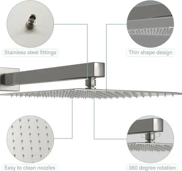 If you are looking for a wall mounted single function shower head. Then this product will be your best choice. 10'' shower head allows you to fully enjoy the water rushing. Gives you an experience similar to natural rainwater. The overhead showerhead features a 360 brass swivel ball head that allows you to adjust the shower angle. This showerhead comes with a brass valve core. Durable while ensuring that you and your family are not scalded by changes in hot and cold water temperatures.