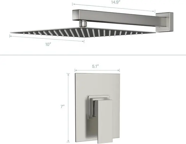 Size: Shower head 10'', Shower Arm 14.9'', Panel 7" L x 5.1"H