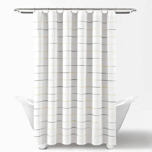 Add classic style and a relaxing vibe to your bathroom with the Lush Decor Ombre Stripe Yarn Dyed Cotton Shower Curtain. Designed with tufted horizontal stripes in a gradience of two complementing colors, woven on solid white fabric. Update your bathroom's look with this cozy chic cotton shower curtain. Soft textures and subtle pops of color adorn this bath curtain. The simple design makes it easy to style in a modern farmhouse, boho, or coastal styled bathroom. This striped shower curtain measures 72 inches wide 72 inches long and is crafted from a 70% recycled cotton/30% recycled polyester fabric blend. The 12 button holes at the top of this shower curtain make it easy to hang with hooks or rings, ensuring a simple installation process. Because this is a fabric shower curtain, we recommend pairing it with a liner, sold separately. This shower curtain is easy to care for. Simply machine wash separately in cold water on the gentle cycle and tumble dry on low. Use only non-chlorine bleach for cleaning or an iron on low heat to release wrinkles, if needed.