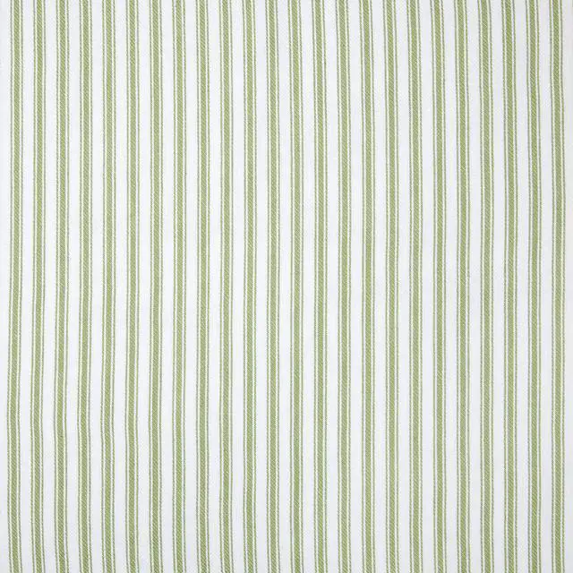 Classic twill weave tarragon green and white ticking stripe shower curtain. Features stitched button holes at top for shower curtain rings (not included) and generous hems. Repeat measures ten green and white stripes per 6 inches. Sturdy 100% cotton. Machine wash cold, line dry. Made in India. Matching window treatments available separately. This delightful color ticking stripe is great for all seasons and decor styles.