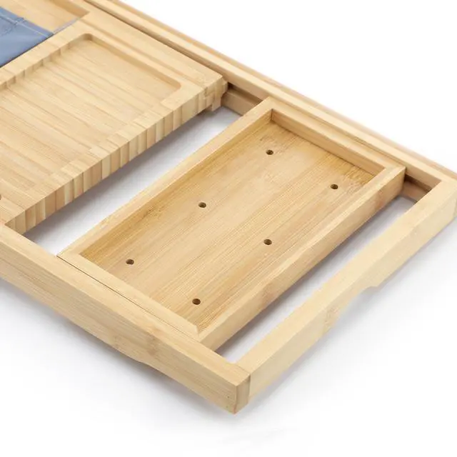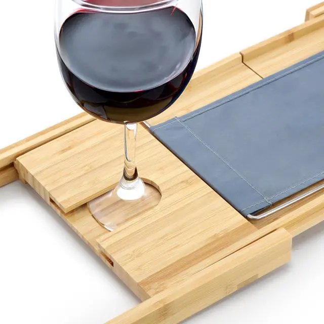 Designed for ultimate relaxation, the MegaChef Expandable Bamboo Wood Bath Tray includes thoughtful features to enhance your bathing experience. Keep your phone or tablet within reach with the built-in stands, perfect for streaming your favorite show or listening to music while you soak. A convenient wine glass holder slot allows you to sip and unwind without any worries, while the generous center platter space is ideal for candles, bath oils, or your favorite snacks. Additionally, two spa trays offer extra organization for beauty products, candles, or small bath essentials, making this tray as functional as it is luxurious. Whether you're treating yourself to a glass of wine, a soothing face mask, or a quiet moment with a book, the MegaChef Expandable Bamboo Wood Bath Tray is your go-to accessory for creating the ultimate bath experience.
