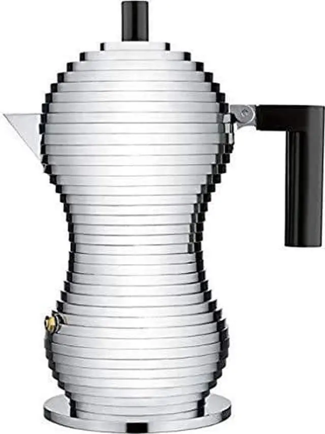 The stove top espresso coffee maker "Pulcina", designed by Michele de Lucchi is the product of intense research into the optimization of the shape of the coffee pot in order to improve and enhance the organoleptic properties of coffee. Thanks to the internal shape of its special heater, "Pulcina" automatically stops filtering the coffee at the right moment. This interruption helps to eliminate the eruption phase, the final filtering stage that generates a burnt and bitter aftertaste, ensuring that only the finest qualities of the coffee are preserved and enhancing its full-bodied and rounded aroma.