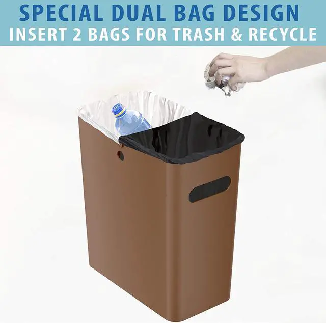 Storage for: File Folder / Stationary / Kid's Room Toys / Garage Tools / Dorm Room Dual Compartment Bin for both Trash and Recycling with patent-pending design It's Slim, it's Giant.... it's SlimGiant! Slim, space-efficient design but giant capacity. Slim enough to fit comfortably in tight spaces: next to the toilet, under the sink or desk. Large, 16 Liter / 4.2 Gallon capacity holds a lot of trash. Made of shatter-resistant and UV-resistant Polypropylene, it is BPA-free and Chlorine-free, and can be wiped clean easily with a damp cloth. MULTIPLE USES - TRASH, RECYCLE, STORAGE, & MORE! Toy Storage Organize toys and other kid's room items easily for efficient storage in the closet. Hanging File Folder Holder Letter size hanging folders fit perfectly, keeping your important documents well organized and easily accessible. Office Supply & Stationary Keep everything you need for your home office organized and close at hand.... and everything else too! Organize and store in the bathroom, kid's room, dorm, bedroom closet, and anywhere else too!