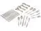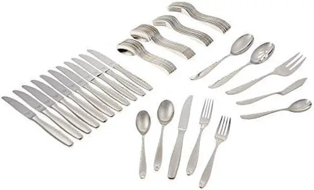 Featuring a light hammered texture to the handles that gleams, this 65-piece stainless steel flatware set includes service for twelve as well as a tablespoon, pierced tablespoon, serving fork, sugar spoon, and butter knife.