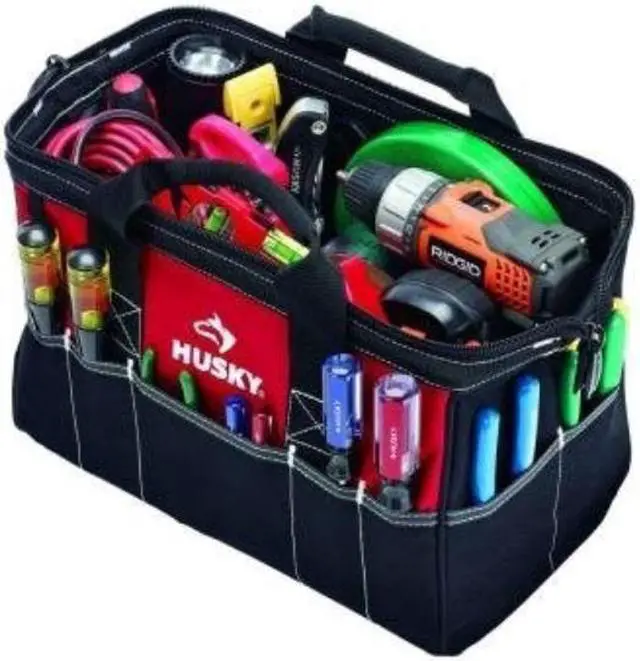 Whether you're working at home or on the job there is no way around the fact that you need to keep your tools in line. Only Husky can be trusted to make bags that optimize storage utility and jobsite durability. This 15-inch bag perfect for DIYers contractors or homeowners utilizes 14 exterior pockets with an expansive interior storage area to hold and organize up to 30 pounds of tools or supplies. This bag will keep its contents safe in any condition indoor or out. With top of the line Bartec Stitching on its thick 600 denier weatherproofed polyester fabric thick straps held together with cross x stitches and a dual zipper system these bags remind you why Husky is the authority on tool storage.