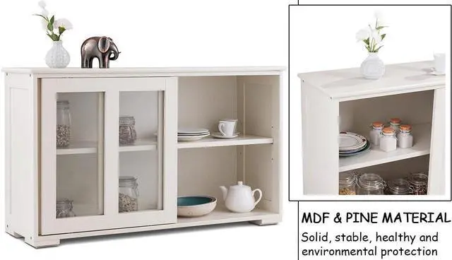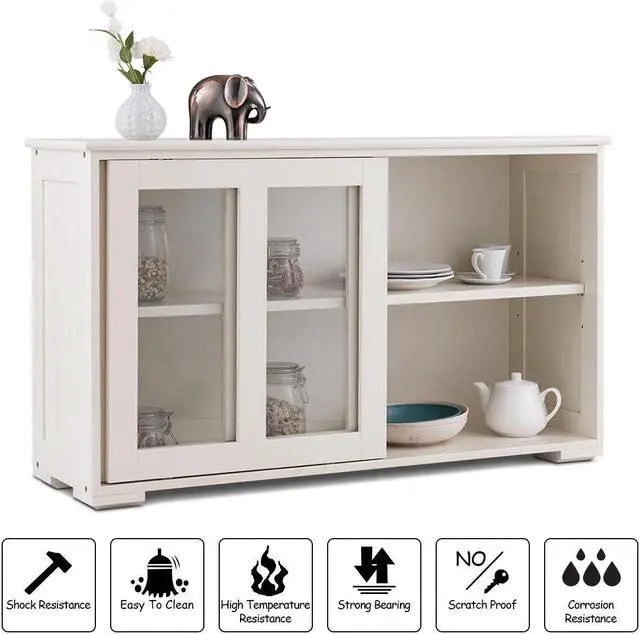This is our kitchen storage cabinet, which is a perfect to fit your kitchen or dining room and provides you with a unmatched convenience. It features a big sliding doors storage cabinet for all your kitchen gadgets and tools, making it a tremendous value as well as a great space saver for your kitchen. Come with a spacious top, this cabinet is great for storage or display. Plus, the solid wood construction and tempered glass doors provides years of sturdy and reliable use. Host dinner parties and prepare great meals with this wonderful kitchen cabinet!