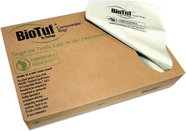 125 trash bags per carton (five rolls of 25 bags per roll). Get rid of trash while keeping garbage cans clean with these liners. Heavy strength is great for kitchen trash and throughout the workplace. The 64 gal. bags fit large receptacles at your home or office. Green trash bag. Optimum lifting strength and load capacity. 100% compostable liner. ASTM D6400 and Biodegradable Plastics Institute certified for composability.