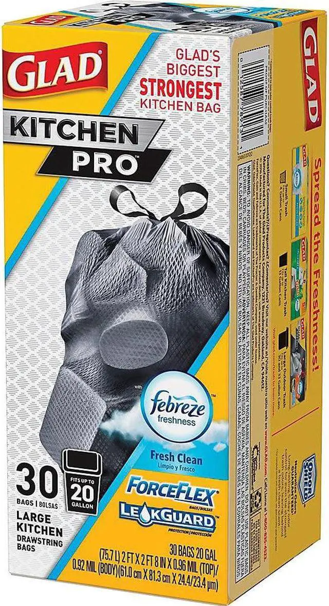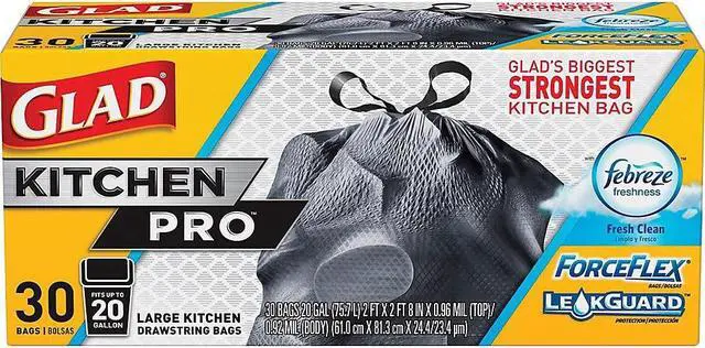 ForceFlex technology protects against tears and punctures 3-ply drawstring closure allows easy closing and lifting with quick pull Febreze freshness neutralizes food odors for 5 days LeakGuard protection handles heavy loads without leaks or spills Designed for use with 20-gallon bins