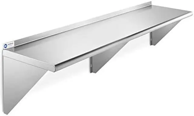 This heavy-duty wall mount shelf by Gridmann is constructed from 18-gauge #430 stainless-steel and is perfect for use in any kitchen, laundry, janitorial room, garage, or anywhere additional storage is needed. It is NSF certified to meet strict standards for public health protection and built for high-volume use to last a lifetime. It features a large, space-saving design that offers plenty of storage as well as a 1-1/2" tall backsplash. Three wall support brackets for maximum capacity and stability. The front edge is rounded for working comfort and three wall support brackets provide maximum stability.