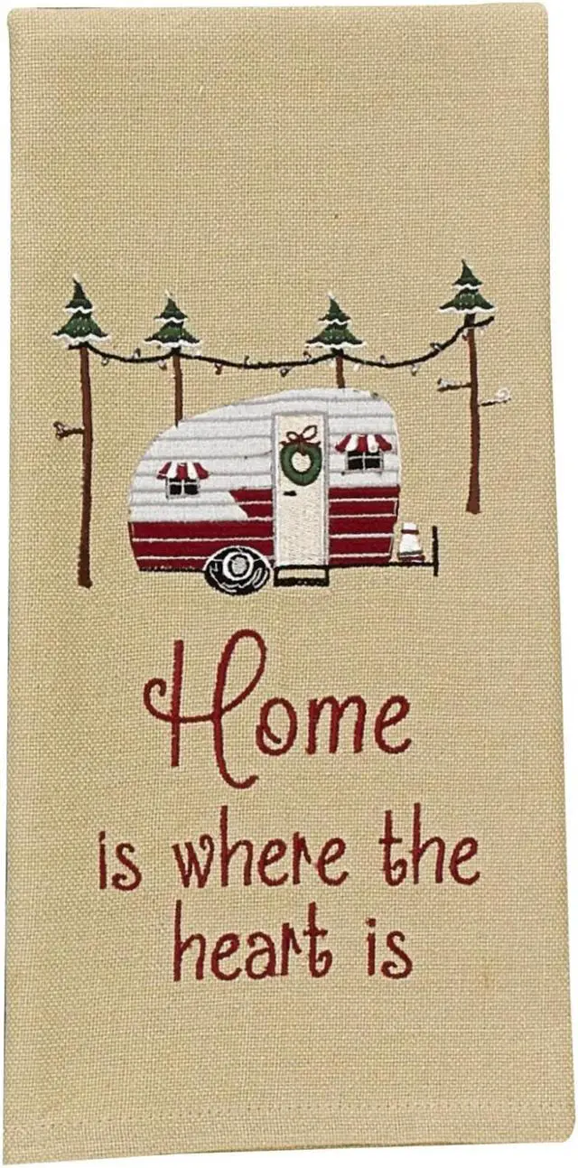 Designed by Karen Cruden. This Christmas themed decorative dishtowel features a small camper with the saying Home is where the heart is embroidered on.