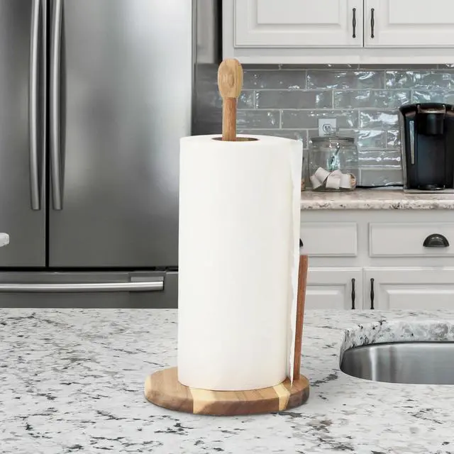The MegaChef Acacia Wood Paper Towel Holder combines rustic charm with practical design to enhance your kitchen counter. Made from high-quality acacia wood, known for its durability and distinctive grain patterns, this paper towel holder adds a touch of warmth and sophistication to your home. The sturdy construction ensures stability, keeping your paper towels secure and easily accessible for quick clean-ups or meal prep. Its sleek, minimalist design fits seamlessly into any kitchen decor, from modern to farmhouse styles.