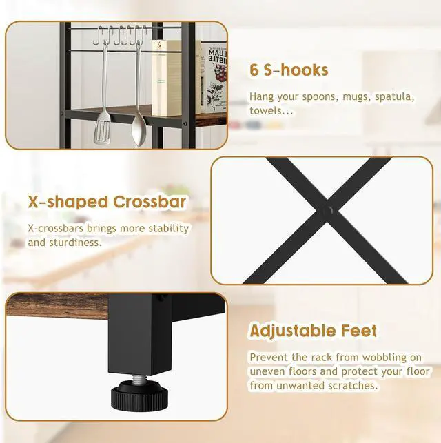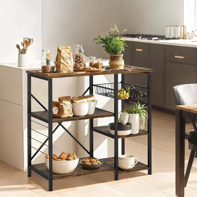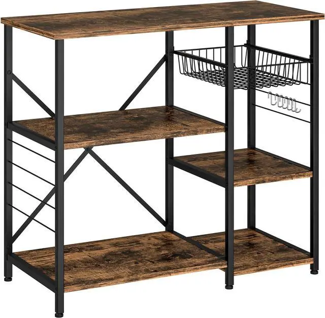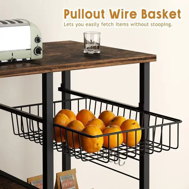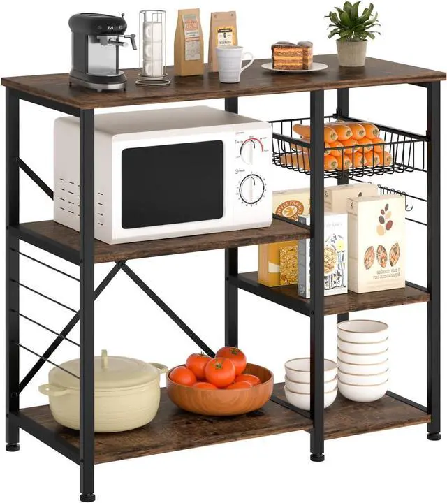 Upgrade your kitchen organization with this industrial-style bakers rack featuring a coffee station, microwave stand, and multiple storage shelves. Designed with a sturdy steel frame and rustic wood finish, it keeps cookware, appliances, cookbooks, and accessories neatly stored. A pull-out wire basket and S-hooks add smart convenience for utensils and towels, while the wide countertop provides space for appliances or food prep.