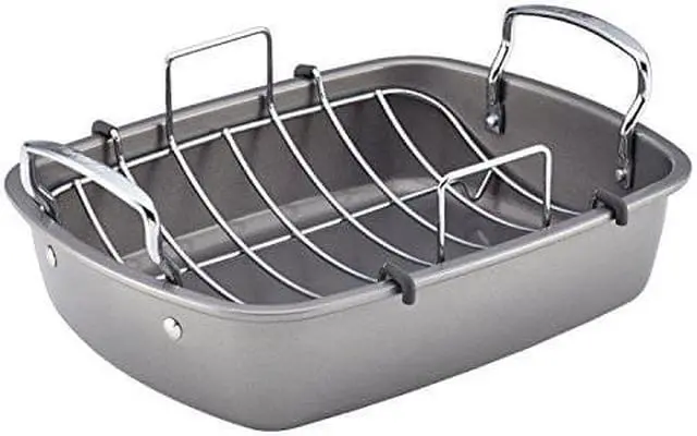 The Circulon Nonstick Bakeware 17 inch by 13 inch Roaster with U-Rack makes it simple to create holiday roasts, family feasts, and more. With its convenient chrome-plated U-shaped rack, this oven roaster keeps meats off the bottom of the pan so unwanted fats drip away to the bottom of the roaster. The heavy-duty steel construction promotes balanced heat distribution for superior cooking performance and long-lasting durability while the nonstick roaster has rolled edges for extra strength. The oven roaster also features premium-quality nonstick for excellent food release and easy cleanup. Oven safe to 450 degree Fahrenheit, this big turkey roaster is a great way to create delicious meals.