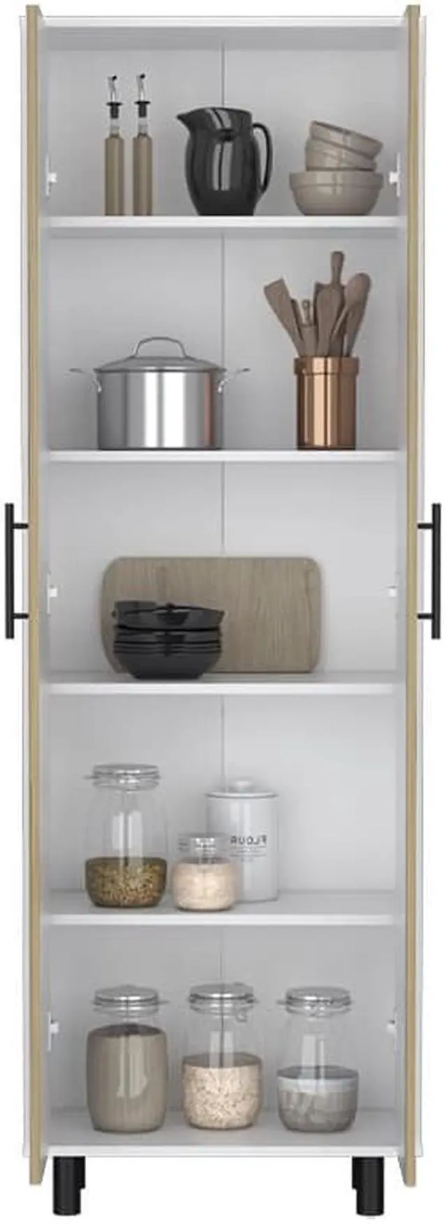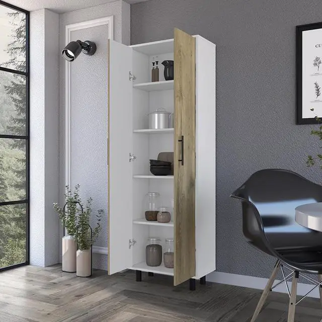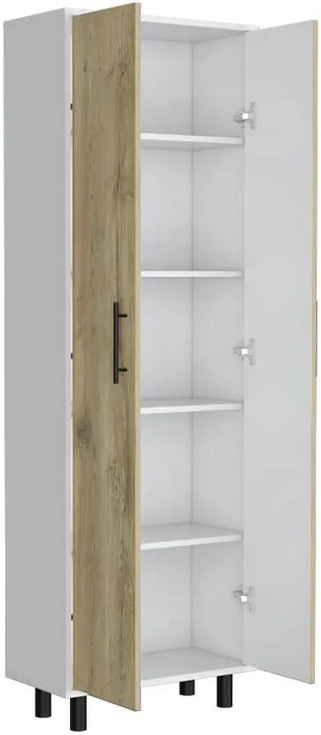 """The Manacor storage cabinet, Macadamia/White is made of wood and has Five shelves, sizes(13"""" H x 22.4"""" W), shelves where you can organize all the products related to food or cleaning in your home. One of the improvements we made lately was to put wheels on it so that you can place it where you want it. Designed with an elegant macadamia/white manufactured wood finish.