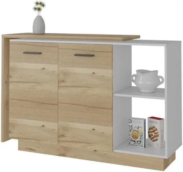 The Aspen Kitchen island is a must-have in your kitchen. Described as the perfect mix of functionality, elegance, and superb design. With a two-level countertop, this product has many features for your convenience. One side features two cabinets that will provide you with a ton of storage space with its three interior shelves for more oversized items (each shelf is 14.3 Inch High x 15 Inch Deep ) and two exterior shelves to display your decorative or frequently usable items. On the other side, you will have plenty of legroom to sit on the kitchen island and enjoy dinner while sitting on a stool, It is made with engineered wood and a combination of light oak and white