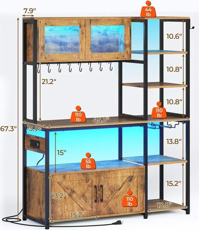 The baker rack features a large 15.7" D x 43.3" W work surface to provides ample operating space and storage space. The right side shelves are pretty for displaying your favorite cookbooks, jars of spices, and canisters of dry goods. Furthermore and more important, this baker rack not only a kitchen island, also as a coffee bar, garage, bookcase, microwave stand, rack organizer, wine organization for living room.