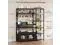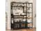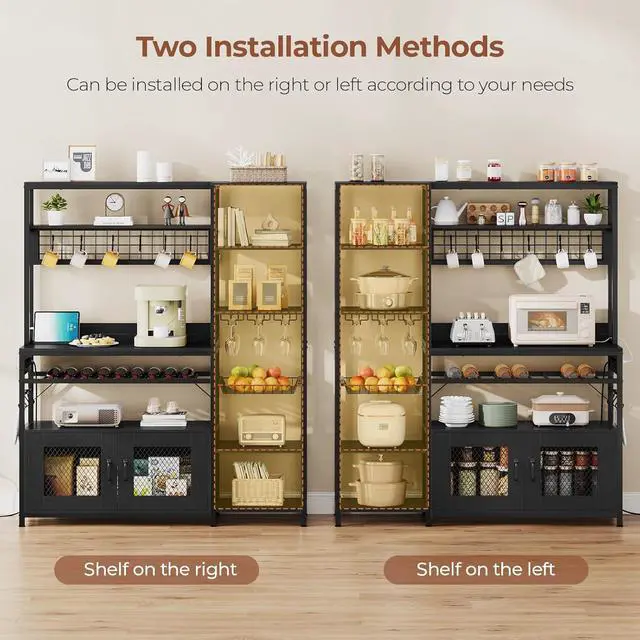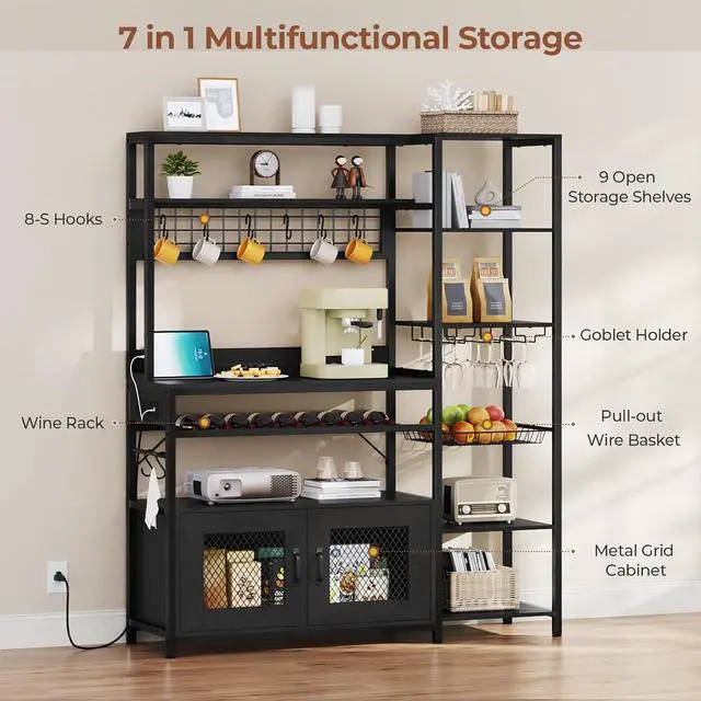 This practical storage rack is 7in1 multifunctional. Its integrated structure includes 8-s hooks, 9 open storage shelves, metal grid, cabinet, wine rack, goblet holder, pull-out wire basket, and is suitable for home kitchens, living room, coffee bar and other scenes.