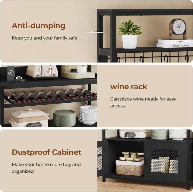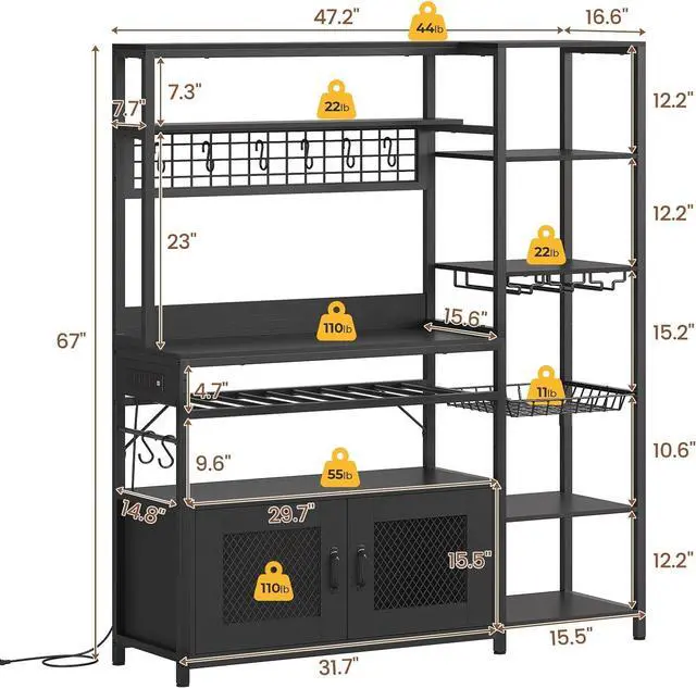 Bakers Rack with Power Outlet, 47.2in Microwave Stand with Storage Shelves, Coffee Bar with Cabinet, Kitchen Pantry Hutch, Side Hooks, Wine Rack, Goblet Holder, Wire Basket (Black, Medium)