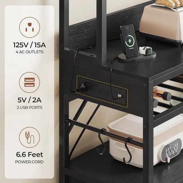 The bakers rack with power outlet has 4 AC outlets and 2 USB sockets, which can meet the simultaneous power needs of multiple appliances such as microwave ovens, bread machines, coffee machines, and mobile phones.