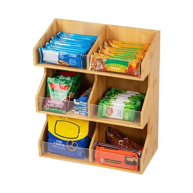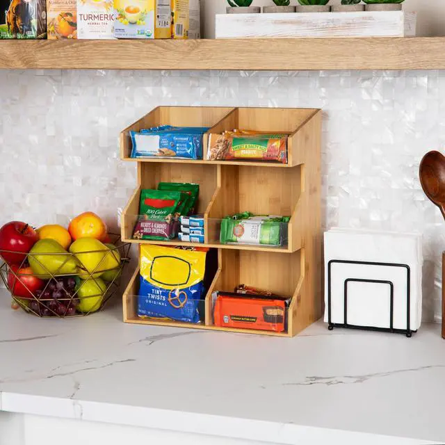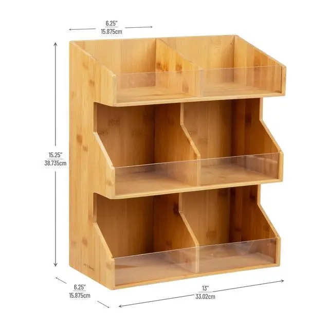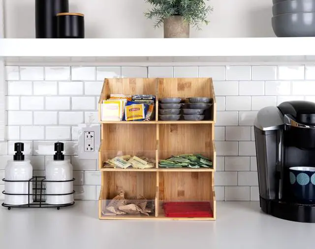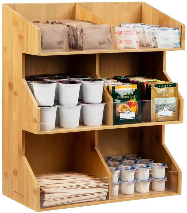 It offers an accessible solution for sorting condiments, coffee pods, tea bags, cups, stirrers, and more. Its stacked sectional design minimizes countertop footprint, keeping everything tidy.