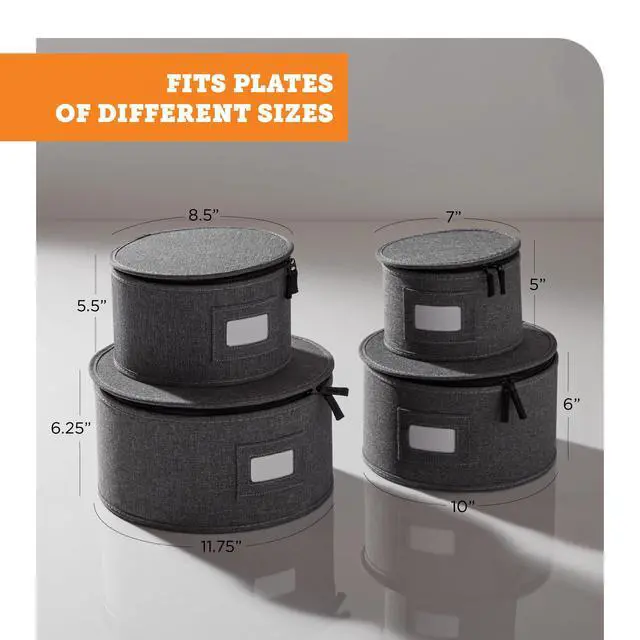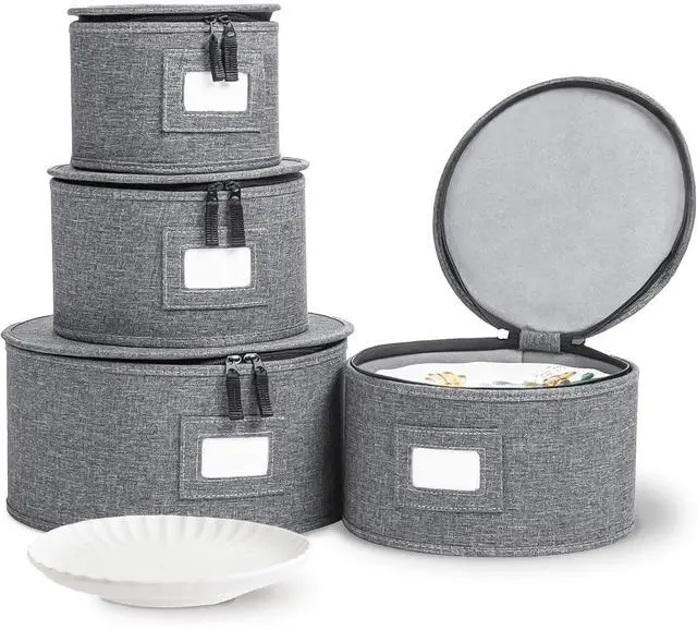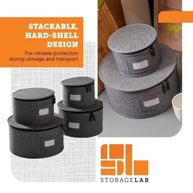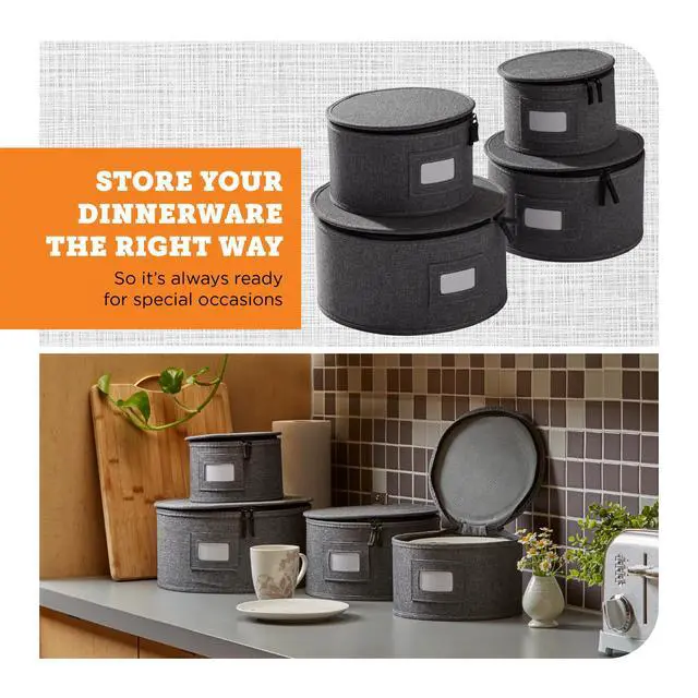 Crafted with a luxurious linen exterior, these plate storage containers boast a reinforced base and sturdy hard-shell construction. They're designed to stack neatly and are built to last, safeguarding your prized plates for years to come.