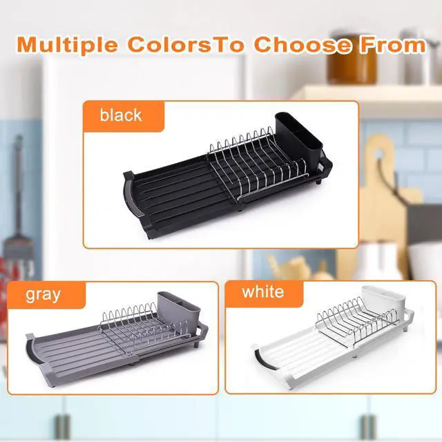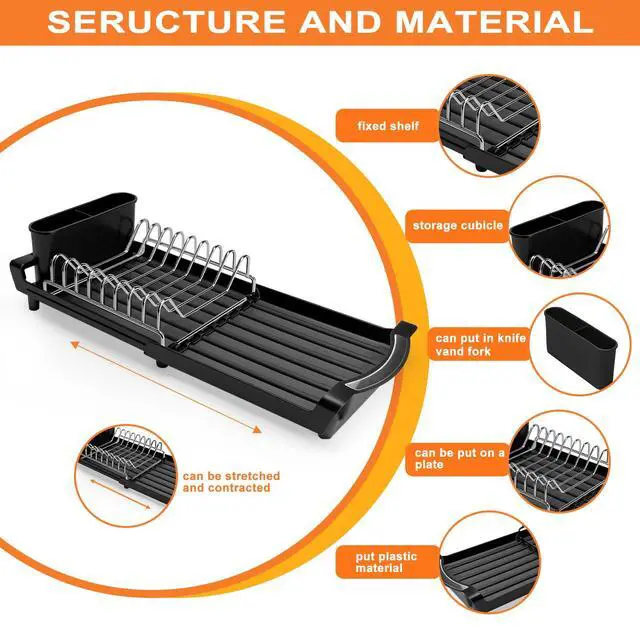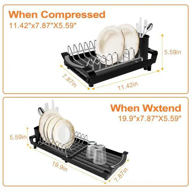 Expandable & Space-Saving DesignOur innovative dish drying rack is designed with adaptability in mind. It effortlessly extends from 11.42" to 19.9" in length, accommodating plates, cups, bowls, and even cutting boards as needed. When not in use, it collapses neatly for easy storage, making it perfect for small kitchens, RVs, dorm rooms, or coffee bars. This feature ensures your kitchen countertop remains clutter-free and organized.
