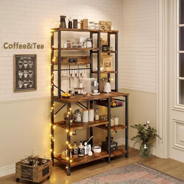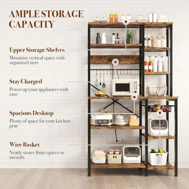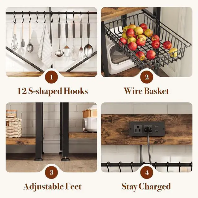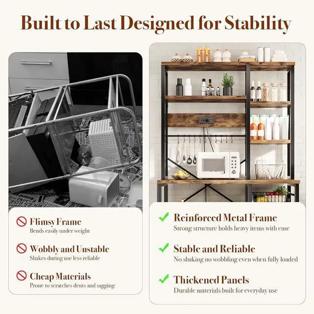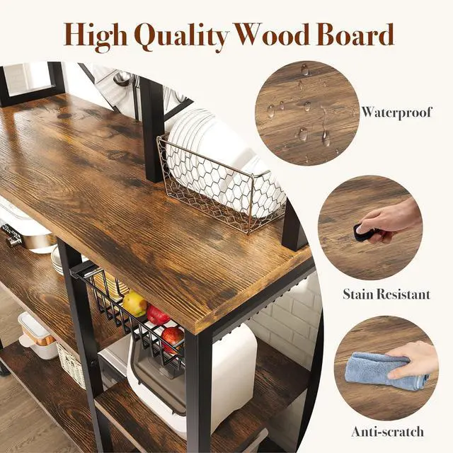 Safe: Crafted from sturdy wood and a durable metal frame, the kitchen shelves offer long-lasting strength. Each shelf holds up to 66 lbs, while adjustable feet and anti-tip devices provide added stability and safety on any floor