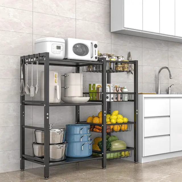 Versatile Storage SolutionThe kitchen baker' s rack combines ample counter space with a 3-tier design that accommodates appliances such as toasters, air fryers, spices, and dishes. This versatile piece functions as a kitchen table, microwave stand, baker' s rack, coffee bar, spice rack organizer, and vegetable storage basket.