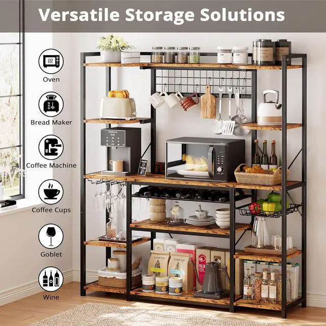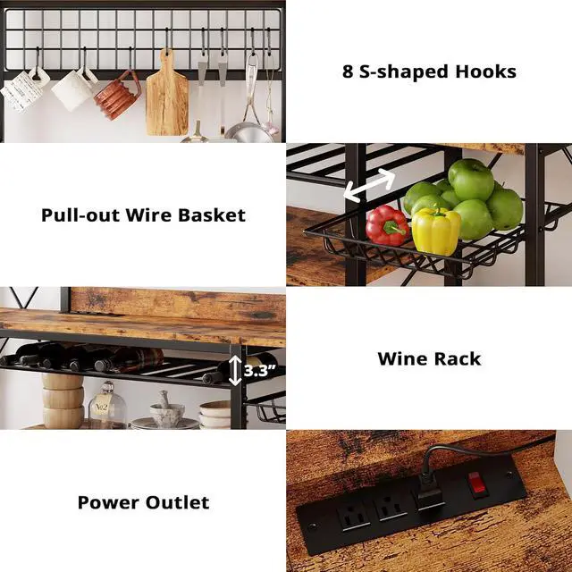Multi-Purpose Storage: This bakers rack offers a variety of storage options, including open shelves, a wine rack, a wire basket, and S-hooks, making it ideal for organizing your kitchen essentials, bottles, or vegetables.