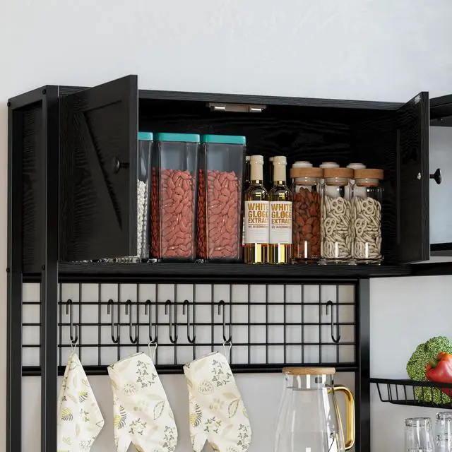 Spacious Storage Rack: Includes 2 cabinets, open shelves, S hooks, metal grid, goblet holder, and wire basket. Ideal for microwaves, coffee bars, bakers, spices, and office storage.