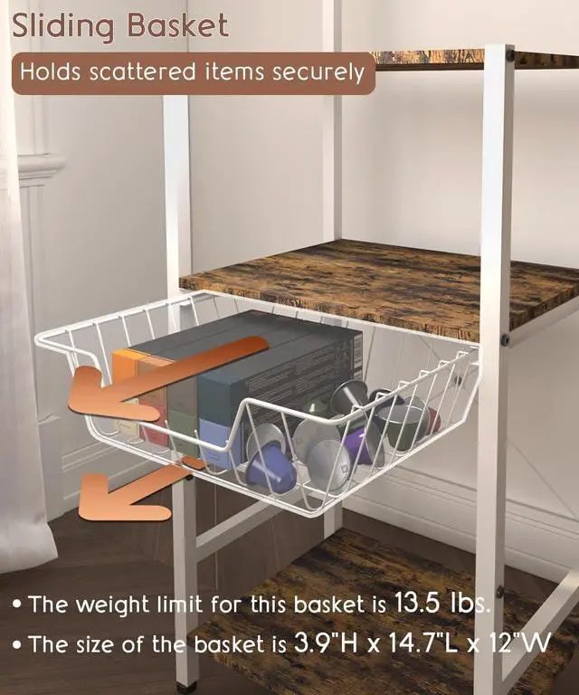 5 Fixed Hooks Wire Grid Panel & Sliding Basket: The wire grid panel in our coffee bar provides more hanging storage space for small kitchenware. The kitchen rack includes 5 fixed hooks and 8 movable hooks, offering flexible organization for your essentials. The sliding wire basket on the middle layer keeps scattered items like coffee capsules. This small shelf organizer helps keep your space tidy while ensuring easy access to your items.