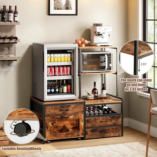 Adjustable Space - Mini Fridge Stand Compatible with Different Small Appliances. The top right side features three adjustable shelves, ideal for placing kitchen appliances such as a coffee machine or microwave. The middle shelf can be adjusted vertically within a 3.93 -inch range, making it easy to accommodate small appliances of various sizes, meeting diverse storage needs with great flexibility.