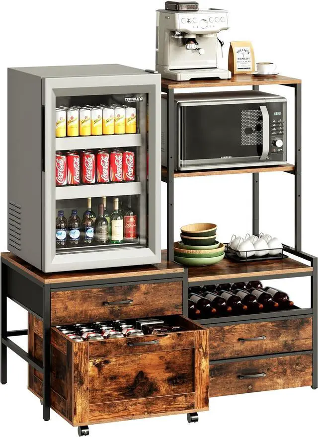Superb Storage Functionality - The mini fridge cabinet comes with multiple storage features. On the left side, there is a fabric drawer and a large wooden drawer with wheels at the bottom, which can be easily pulled out for storing various everyday items. On the right side, there are two fabric drawers and a wine rack that can hold up to 14 bottles of wine, perfectly balancing storage and decorative functionality.