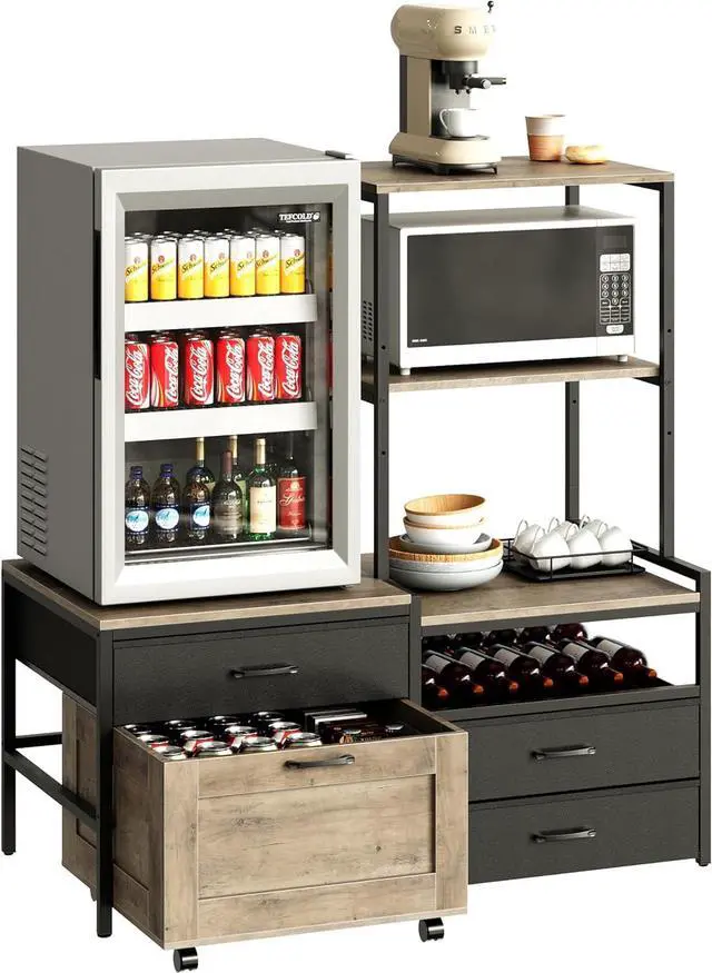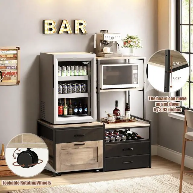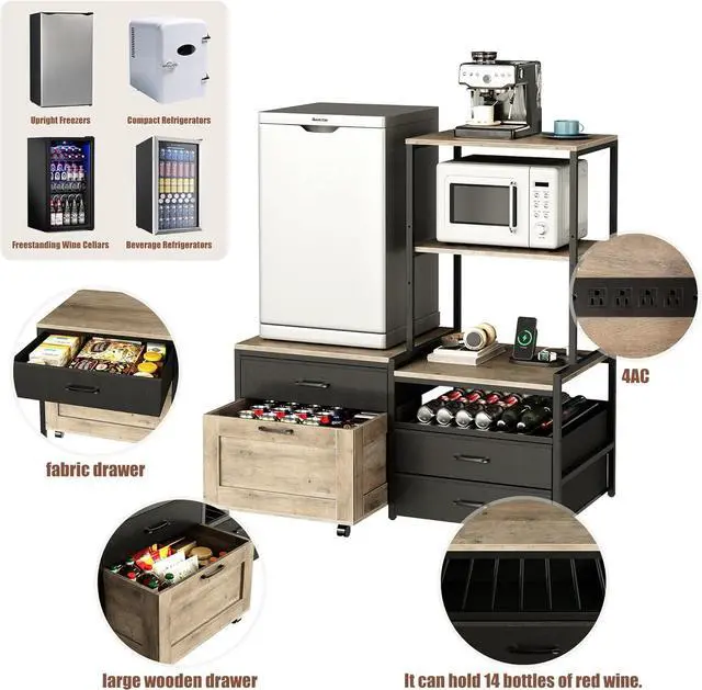 Superb Storage Functionality - The mini fridge cabinet comes with multiple storage features. On the left side, there is a fabric drawer and a large wooden drawer with wheels at the bottom, which can be easily pulled out for storing various everyday items. On the right side, there are two fabric drawers and a wine rack that can hold up to 14 bottles of wine, perfectly balancing storage and decorative functionality.