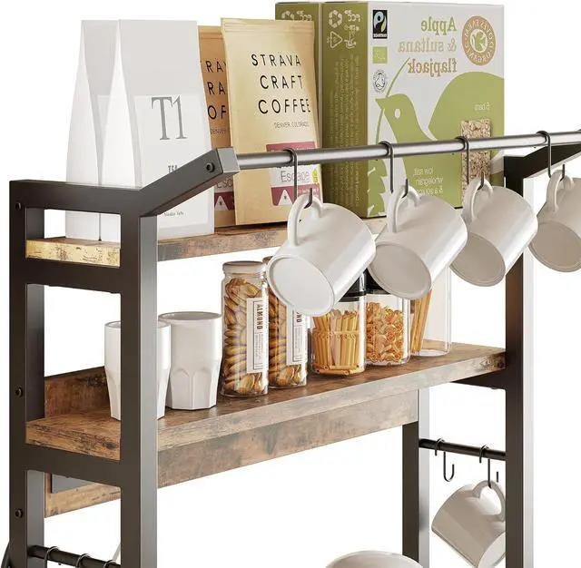 Plenty of Space: 3 Large wide counter top for your microwave, rice cooker, coffee maker, toaster and other kitchen utensils9 S-shaped hooks for your mugs, spoons, spatulas, whisk