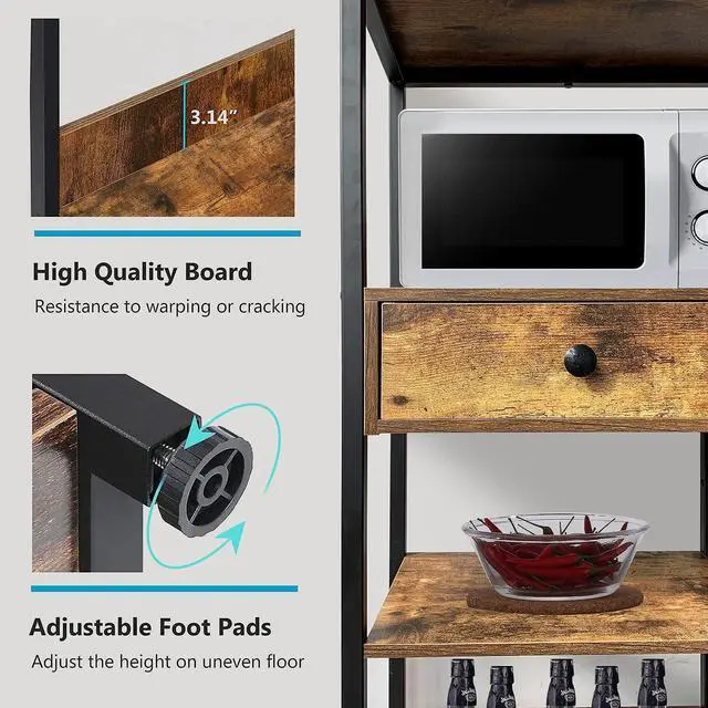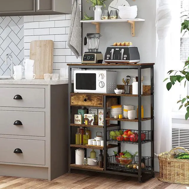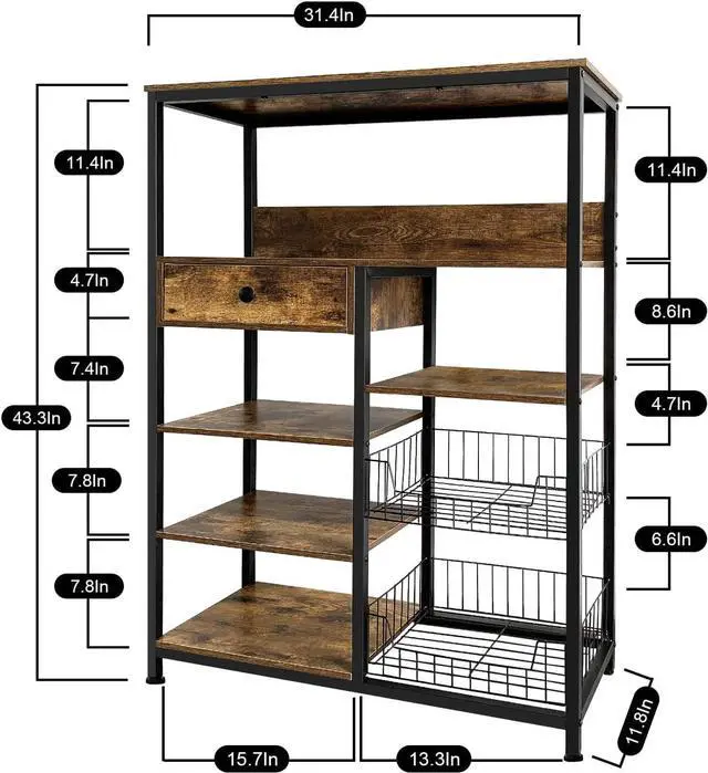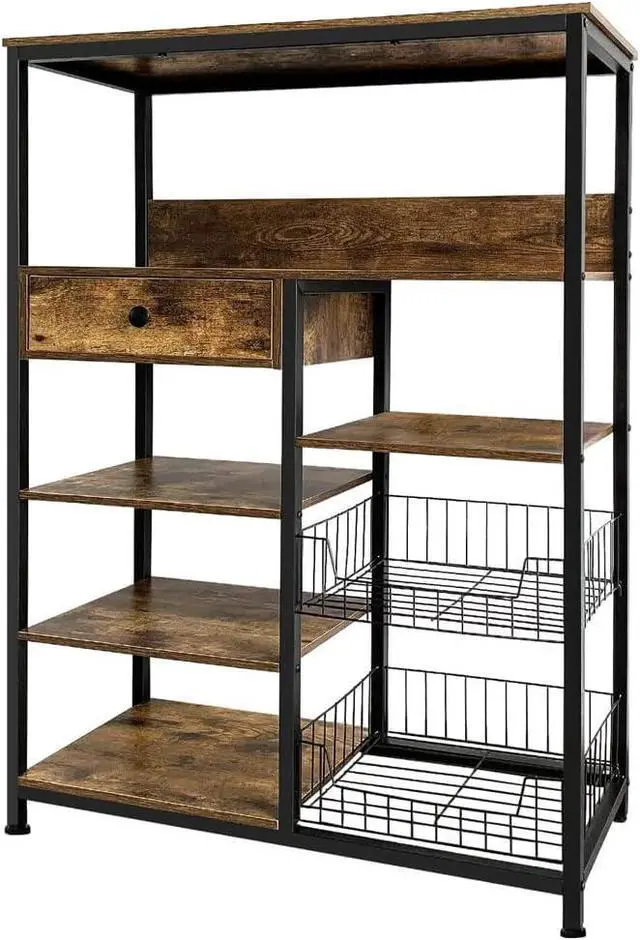 Large Storage CapacityFive open shelves with different size offer ample storage space to store and organize your kitchenware, oven, bread maker, juicer while two baskets can store fruits and vegetables or some kitchen essentials.