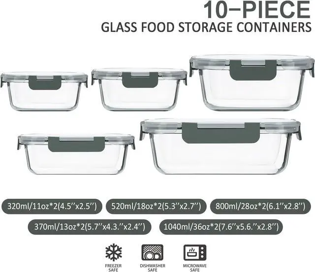 Set includes: 2 (11 oz), 2 (13 oz), 2 (18 oz) 2 (28 oz ) 2 (36 oz) lids included. Featuring multiple sizes, these glass bowls with lids can be used for food storage and transport, meal prep, leftovers storage, restaurant and deli takeaway, portion control, picnics and camping