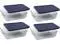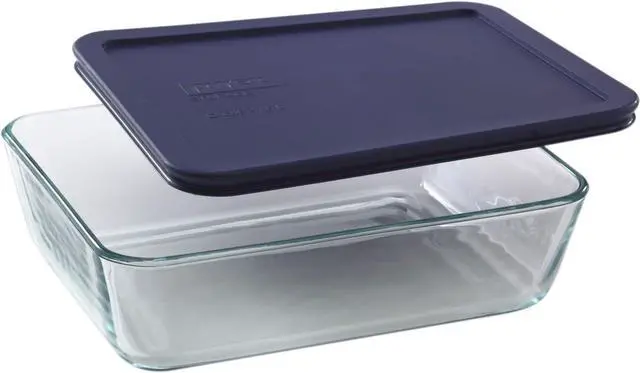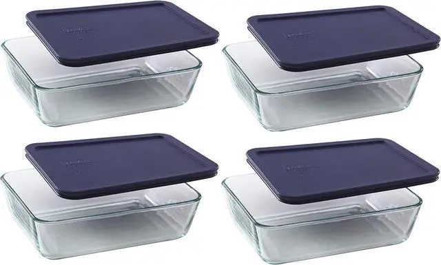 Included: (4) 7211 6-Cup Rectangular Pyrex Dishes and (4) 7211-PC 6-Cup Blue Plastic Lids