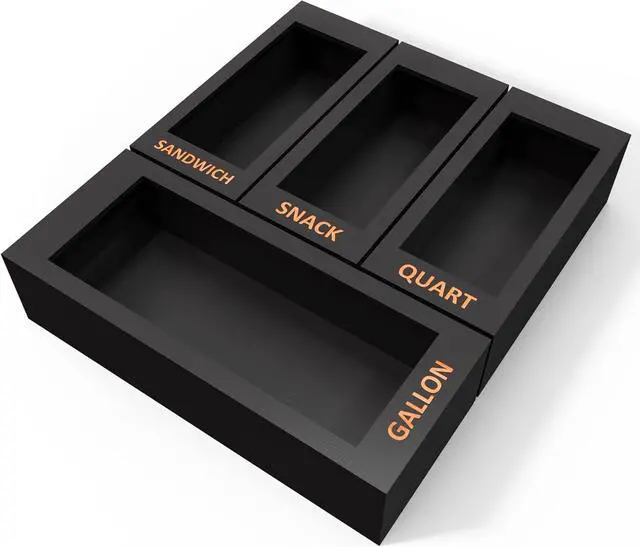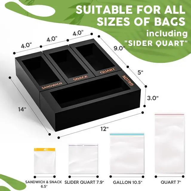 FIT VARIOUS BRANDS STORAGES BAGS: Our zip lock bag container organizer is compatible with Solimo, Hefty, Glad, Great Value and various brands storage, freezer and slider bags. Perfectly store of sandwich, quart, snack, gallon bags. extra wide openings for store and remove bags easily.