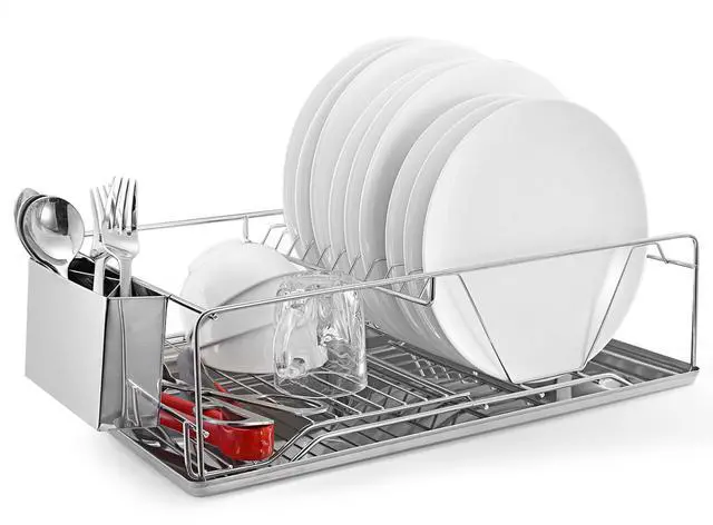 Our dish rack adopting high-grade stainless steel materials and premium electroplating finish is sturdy, durable, not easy to rust and gorgeous to match with all types of kitchen rooms. It can not only store your dishes, cups and bowls in order but also can accelerate air circulation and dry the tableware quickly to avoid the breeding of bacteria with its wholly hollow-out design. Additionally, it specially comes with a detachable cutlery holder which has three compartments inside and overspreads drain holes at the bottom to store the cutleries and a drain board to collect dishwater and allow the dish rack stands in place without sliding.
