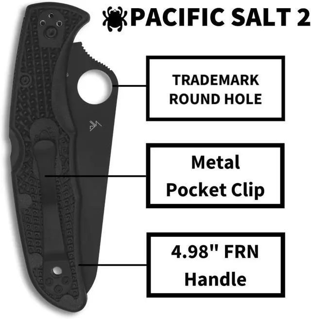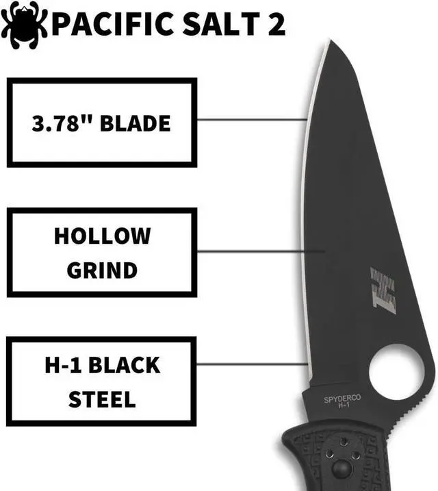The heart of this version of the Pacific Salt 2 is its hollow-ground blade, which is crafted from H-2Spydercos most corrosion-resistant alloy. Available in both PlainEdge and fully serrated SpyderEdge configurations, the blade features a fully accessible Trademark Round Hole for swift, ambidextrous, one-handed opening.